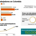 En Colombia, según el informe presentado esta semana por el Ministerio TIC, la cantidad de teletrabajadores pasó de 31.553 a 39.767 entre 2012 y 2014. La meta para 2018, según el viceministro de Relaciones Laborales, Enrique Borda, es 150.000 personas. Ayer, nueve empresas, entre ellas la Agencia Nacional de Hidrocarburos, la Anspe y el Acueducto de Bogotá, se sumaron al pacto por el teletrabajo, promovido por las carteras TIC y de Trabajo. Se completan así 168 empresas vinculadas, de las cuales 52% son privadas.